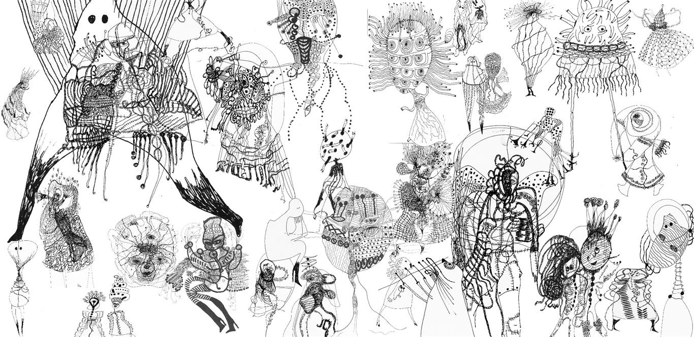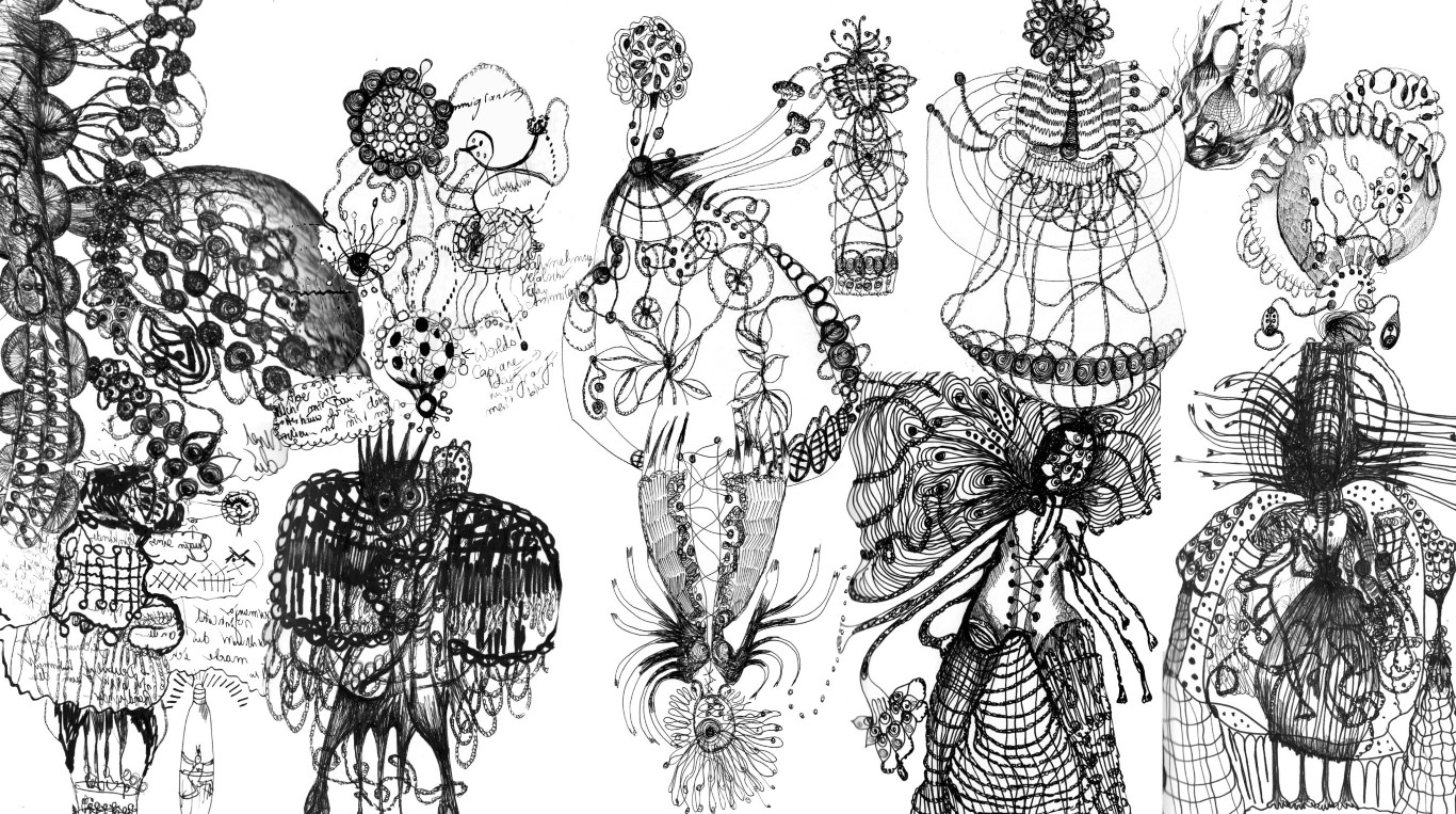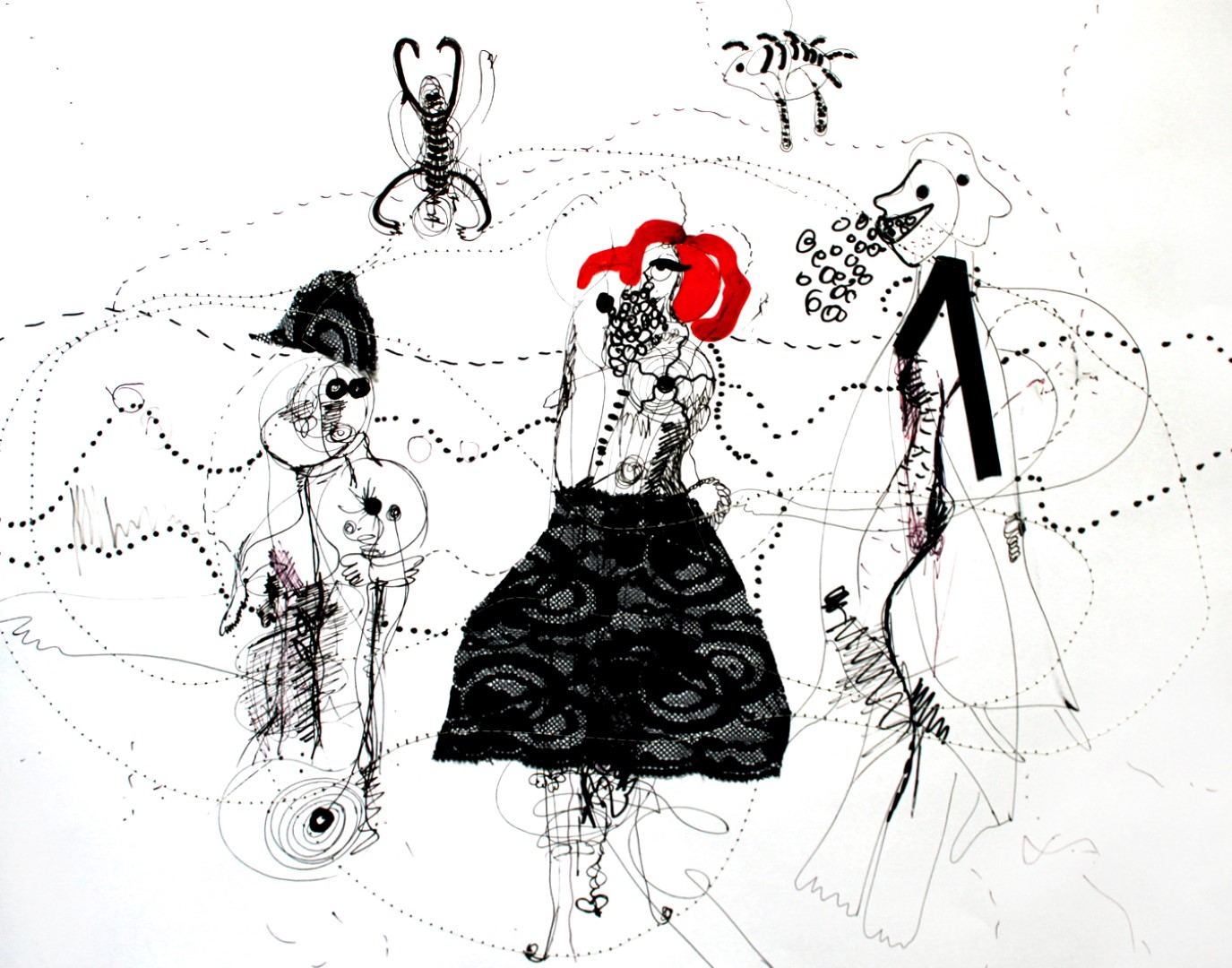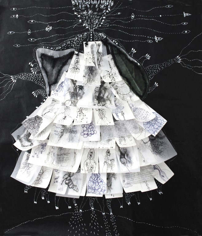 Das Kleid, kleine Zeichnungen (genäht, geklebt), Stoffreste, auf schwarzem Packpapier, ca. 100 x 120 cm |