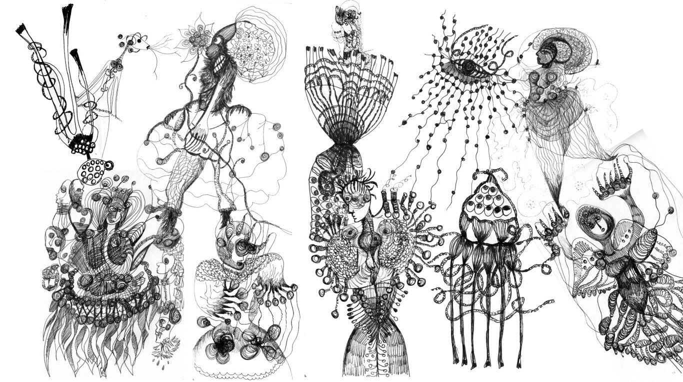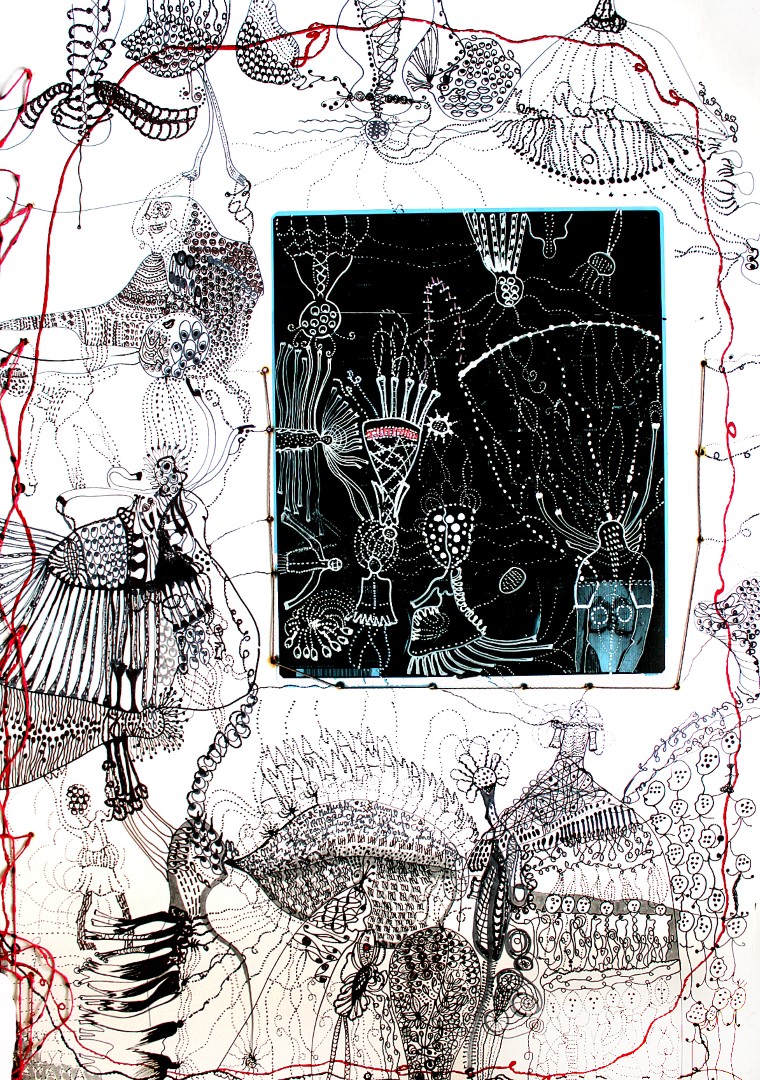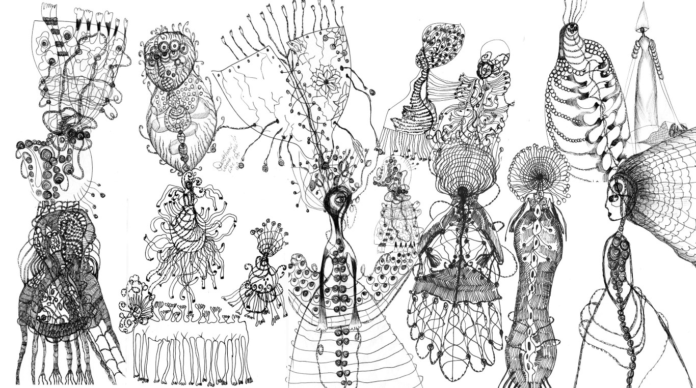Das Kleid, kleine Zeichnungen (genäht, geklebt), Stoffreste, auf schwarzem Packpapier, ca. 100 x 120 cm |
