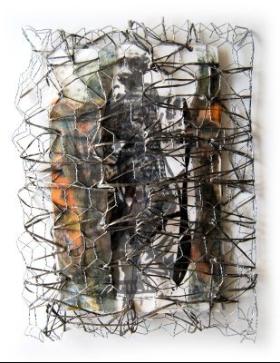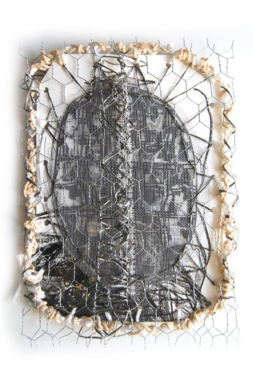 Kopf, textiles Objekt / laminierte Zeichnungen, Stoff, Fäden, Draht, ca. 20 x 30 cm