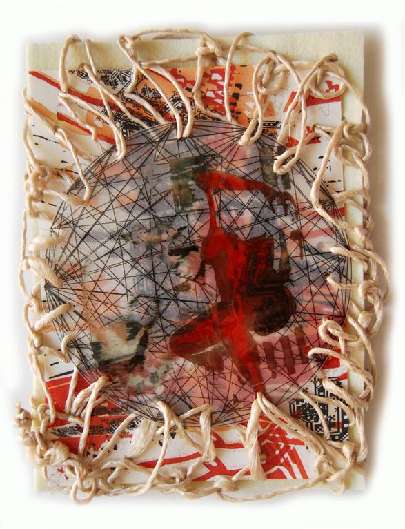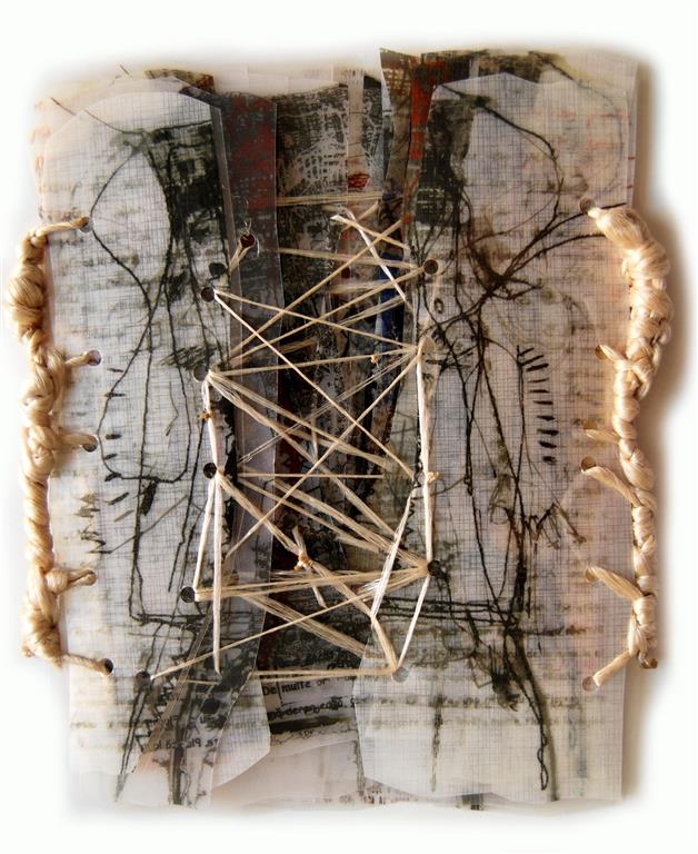 O.T., textiles Objekt / laminierte Zeichnungen, Stoff, Fäden, Draht, ca. 20 x 30 cm