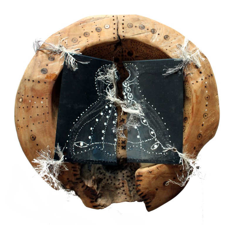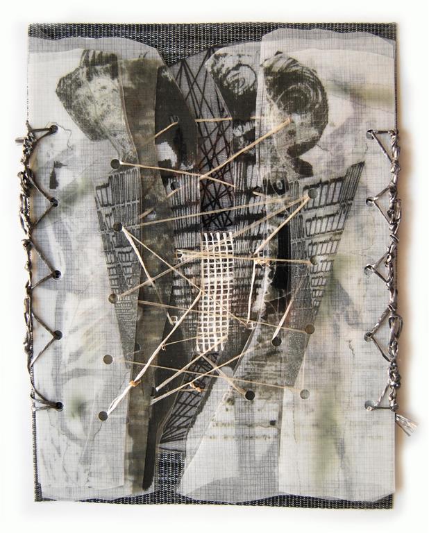 Genähte Wunden / Buch des Lebens, textiles Objekt / laminierte Zeichnungen, Stoff, Fäden, ca. 20 x 30 cm