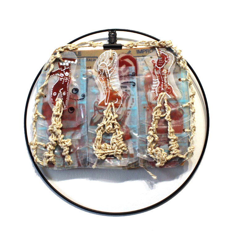 3 sichtbare Seiten, textiles Objekt / laminierte Zeichnungen, Stoff, Plastik, Fäden, ca. 15 x 20 cm