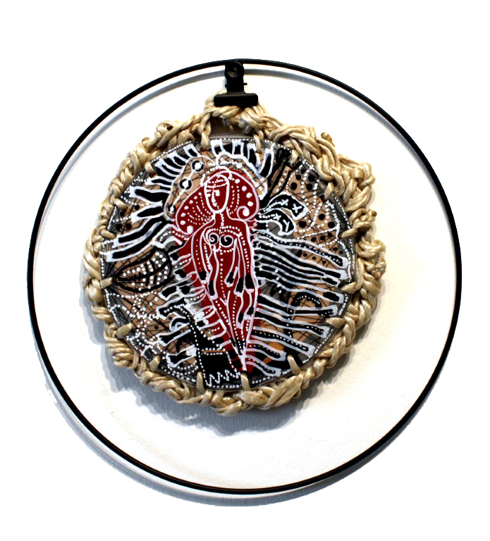 Frau, textiles Objekt, Vorder- und Rückseite / laminierte Zeichnungen, Stoff, Plastik, Fäden, ca. 17 x 17 cm