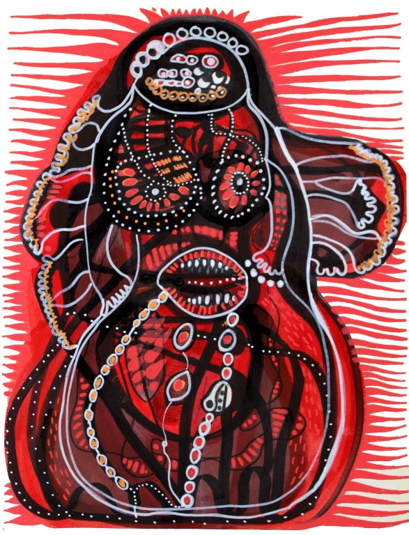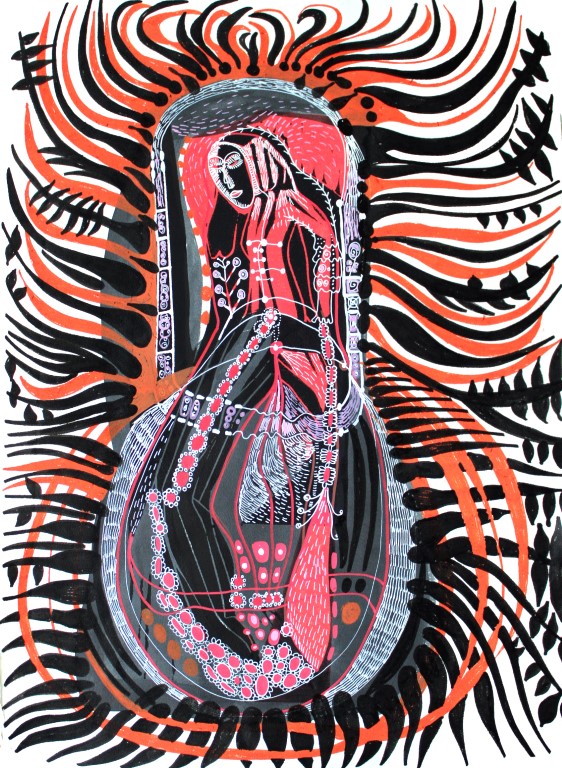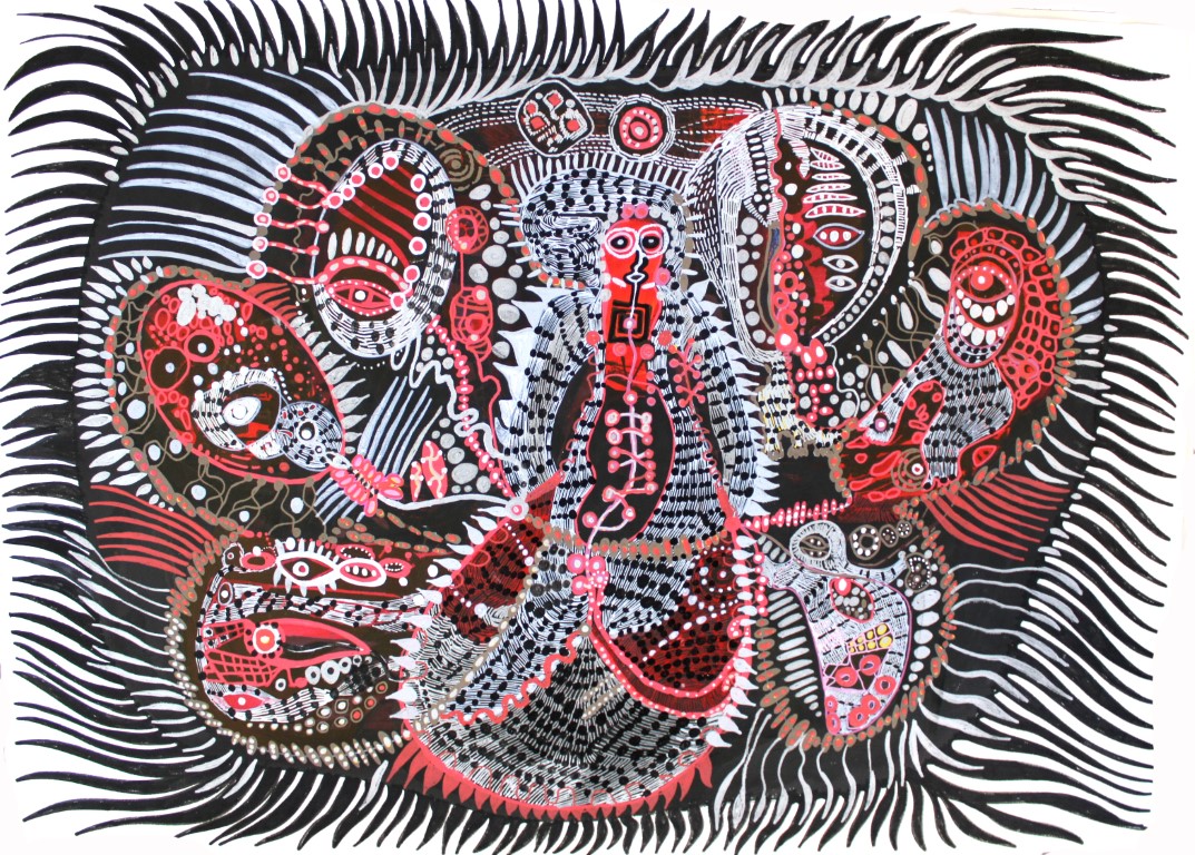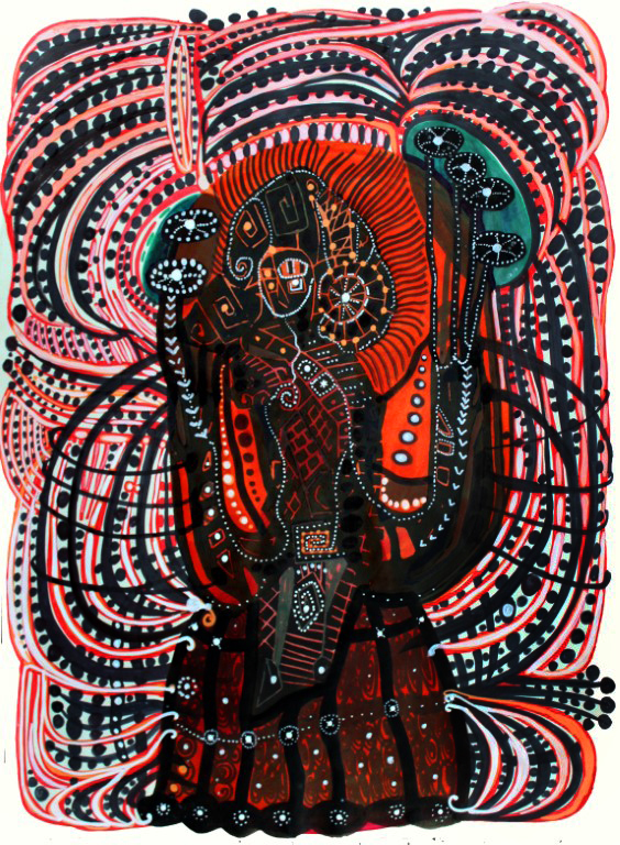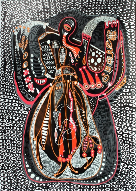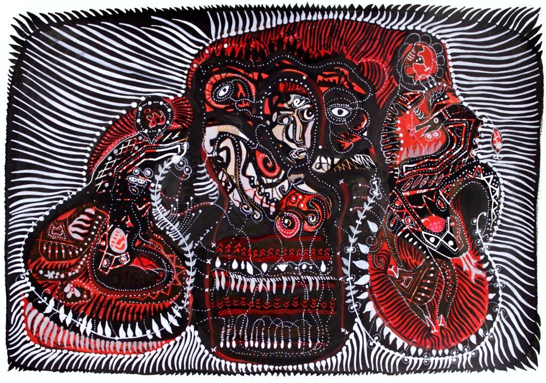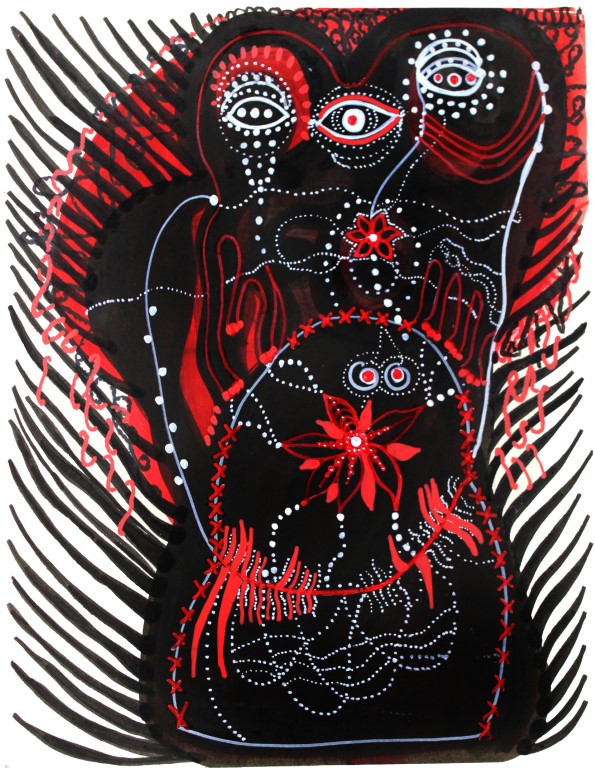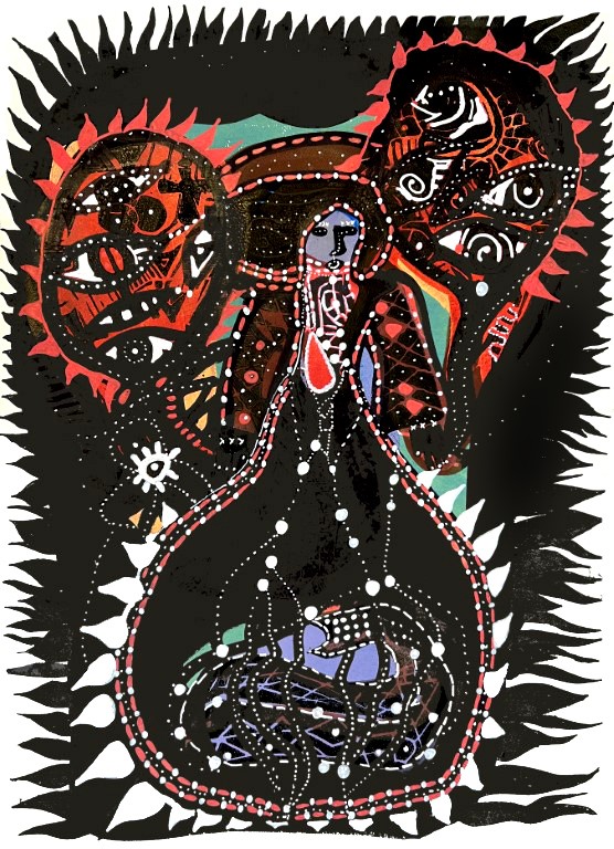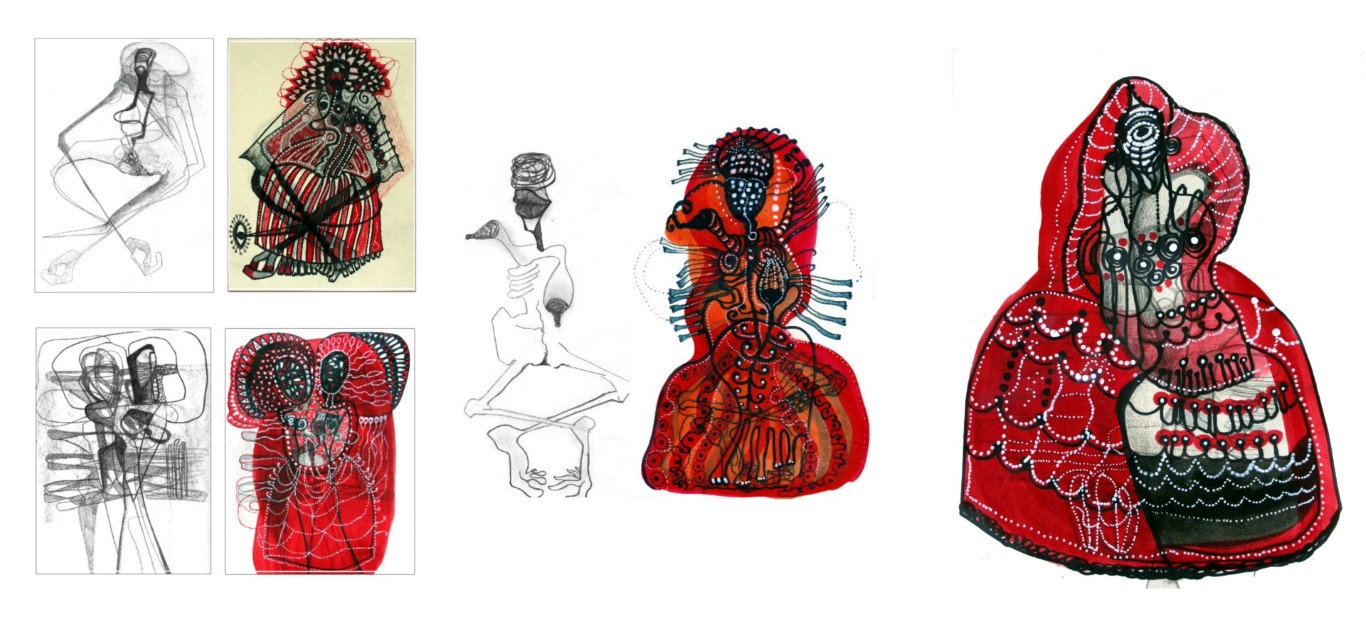 Matruschkas & Totems, u.a., Grafiken, Auswahl (Zeichnungen / Malerei und überzeichnete / übermalte Druckgrafiken wie Linol- und Holzdruck