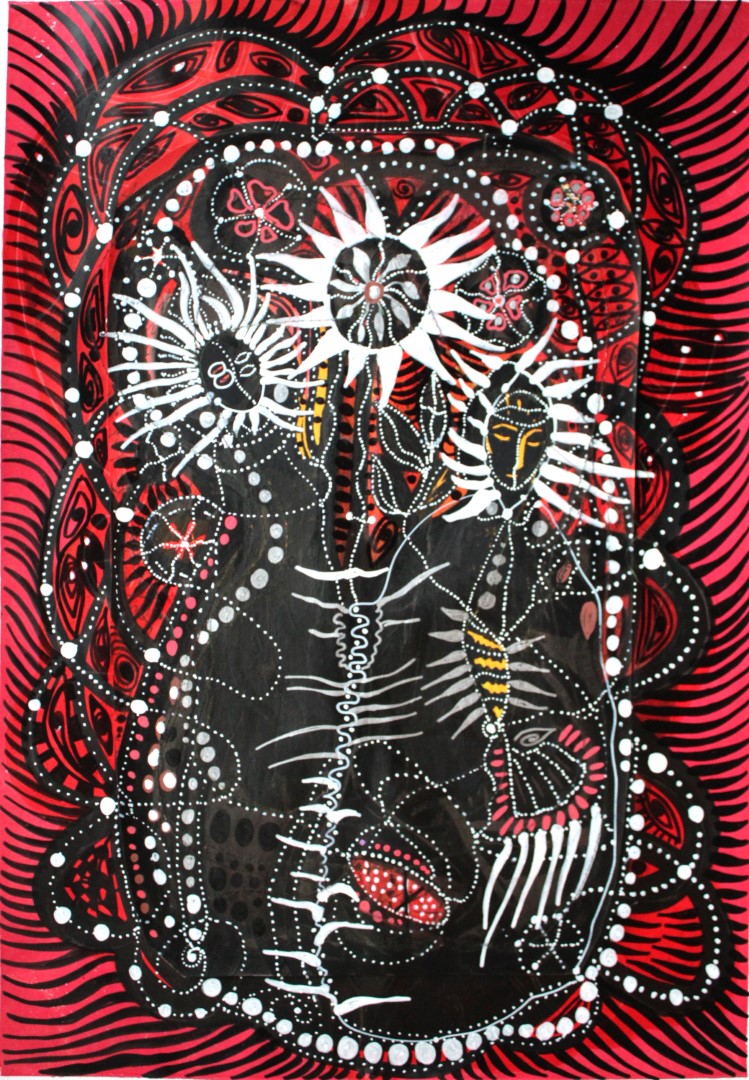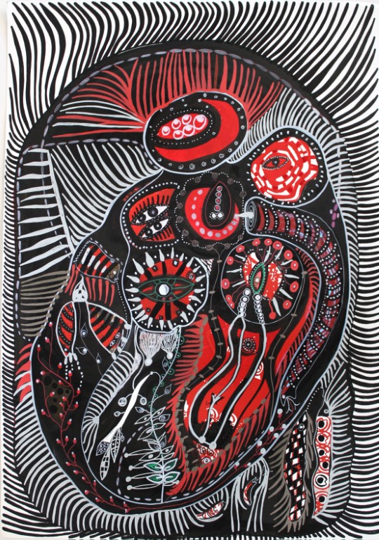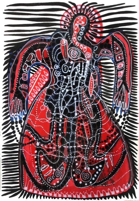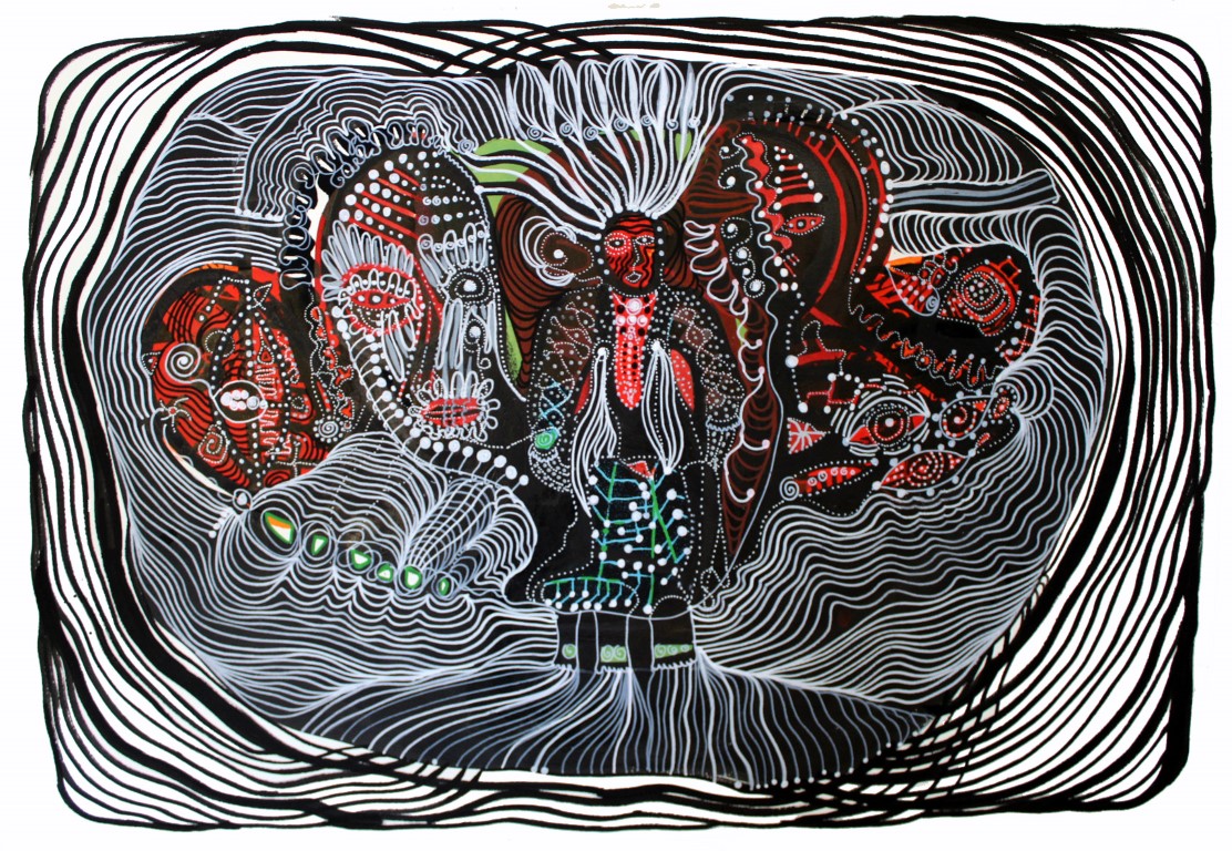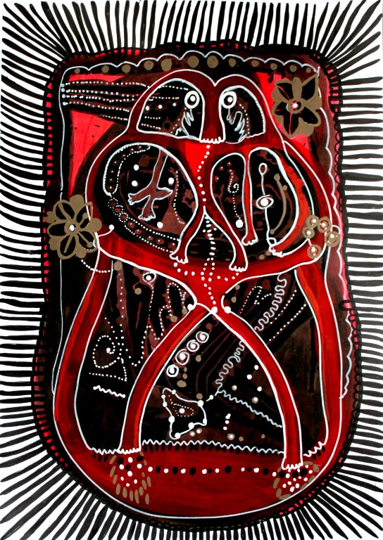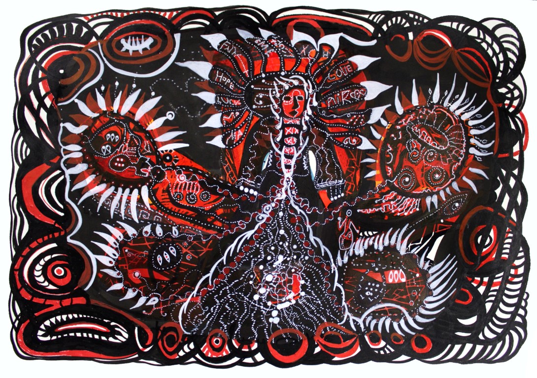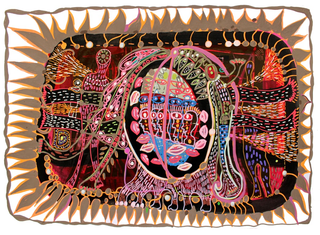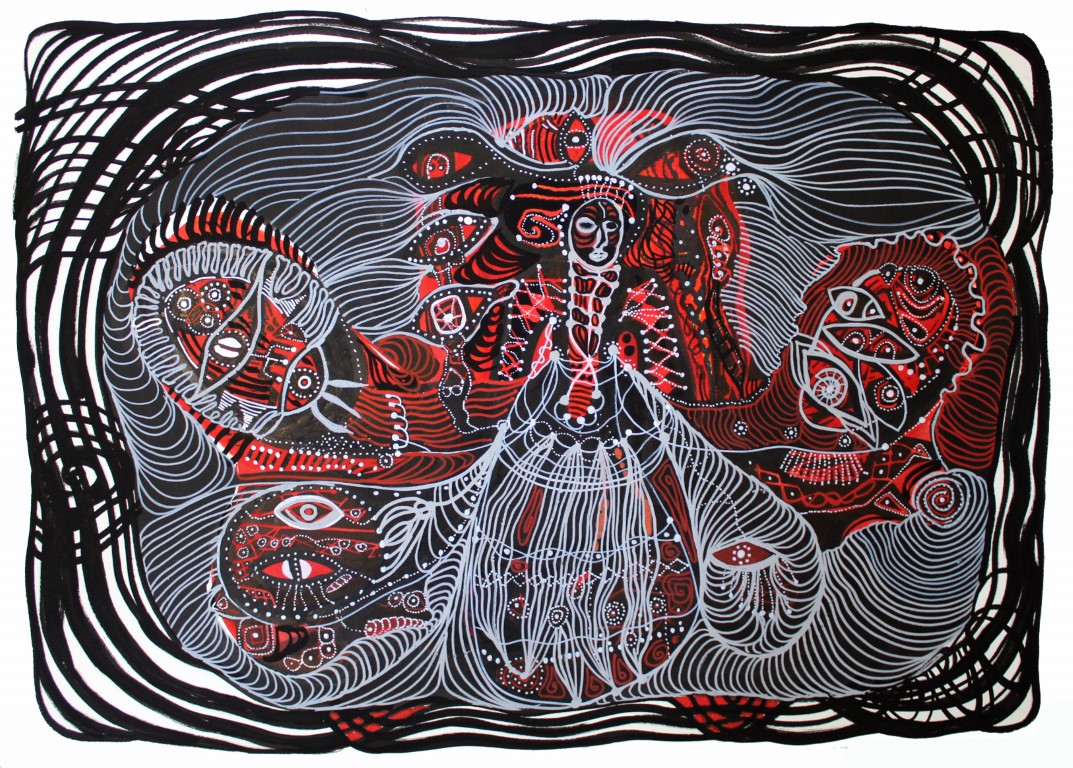 Matruschkas & Totems, u.a., Grafiken, Auswahl (Zeichnungen / Malerei und überzeichnete / übermalte Druckgrafiken wie Linol- und Holzdruck