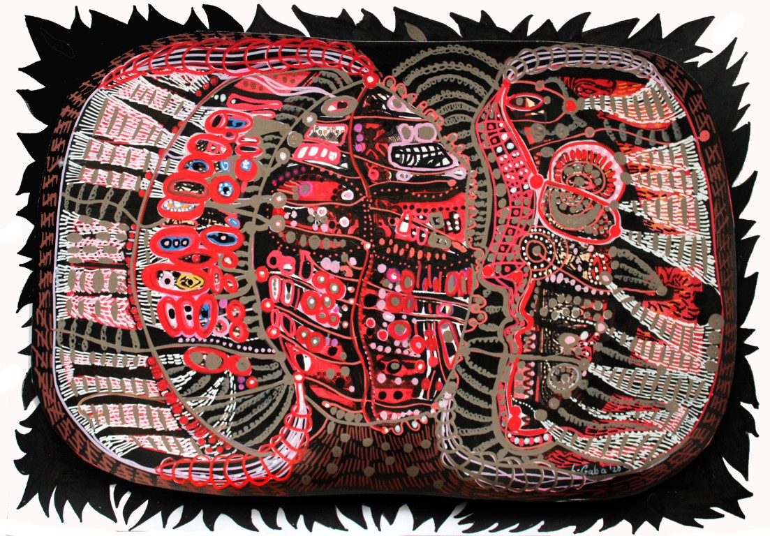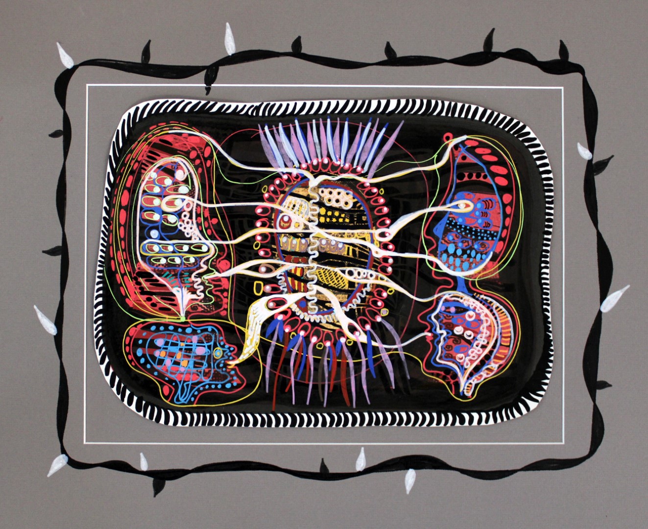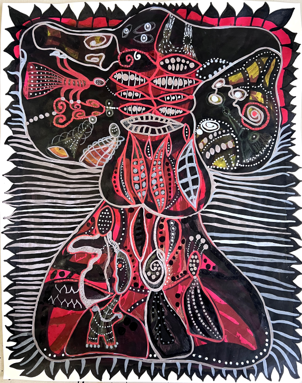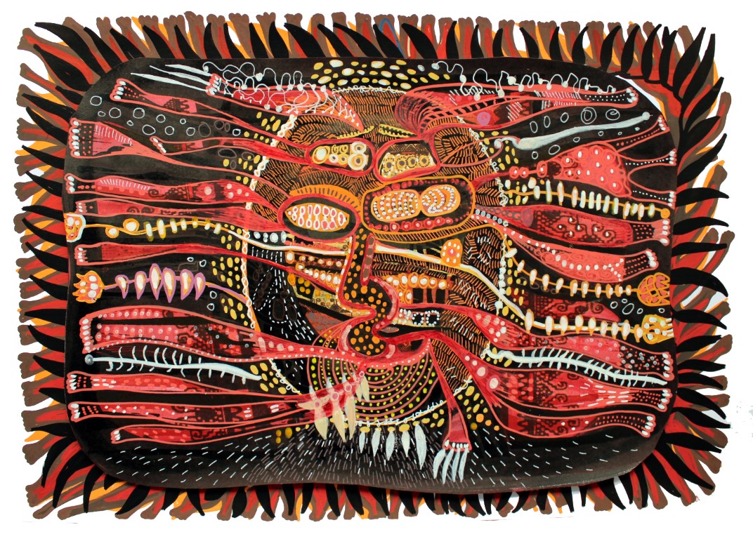 Tier-Totem, übermalter Linoldruck auf Papier, ca. 30 x 40 cm |