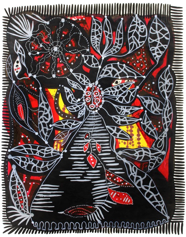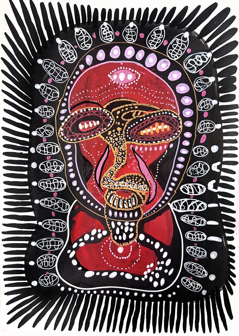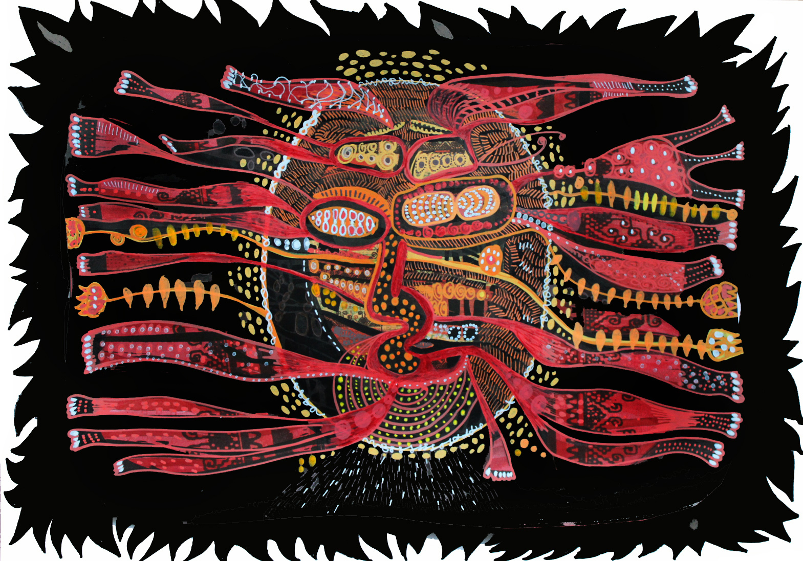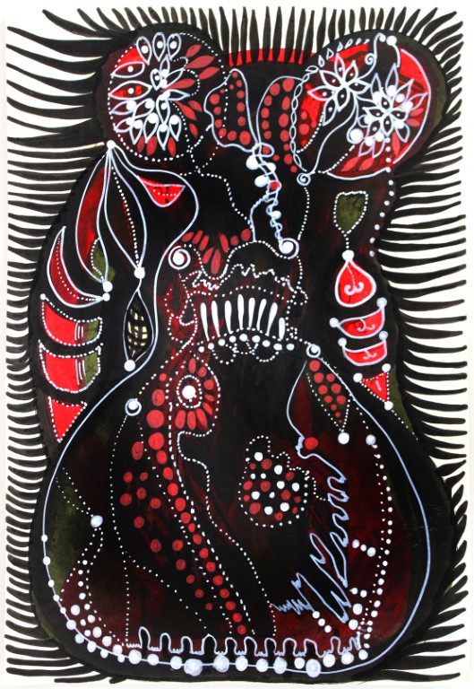 Tier-Totem, übermalter Linoldruck auf Papier, ca. 30 x 40 cm |