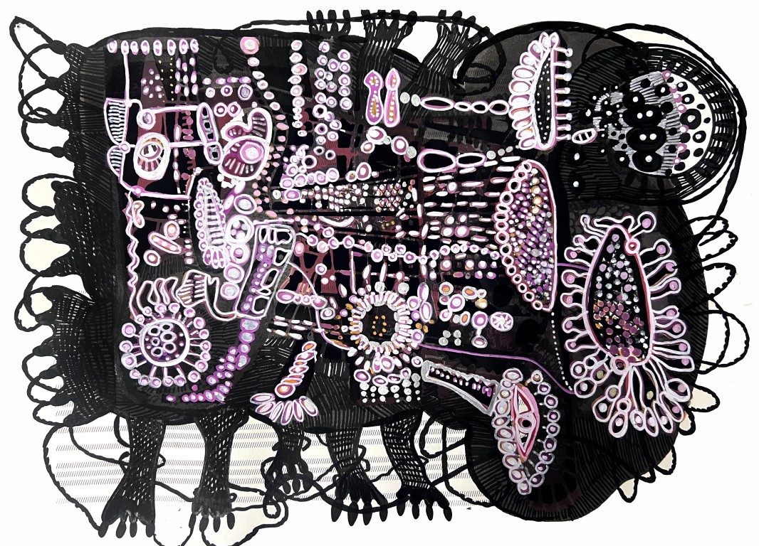 Übermalte Zeichnungen, Tusche, Marker und Lack auf Papier, A4 |