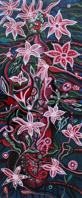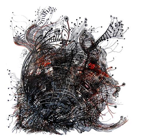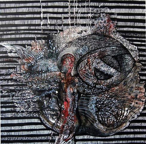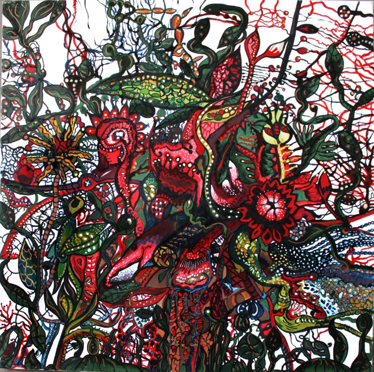 | Tusche, Acryl und Marker auf Leinwand, 100 x 100 cm |