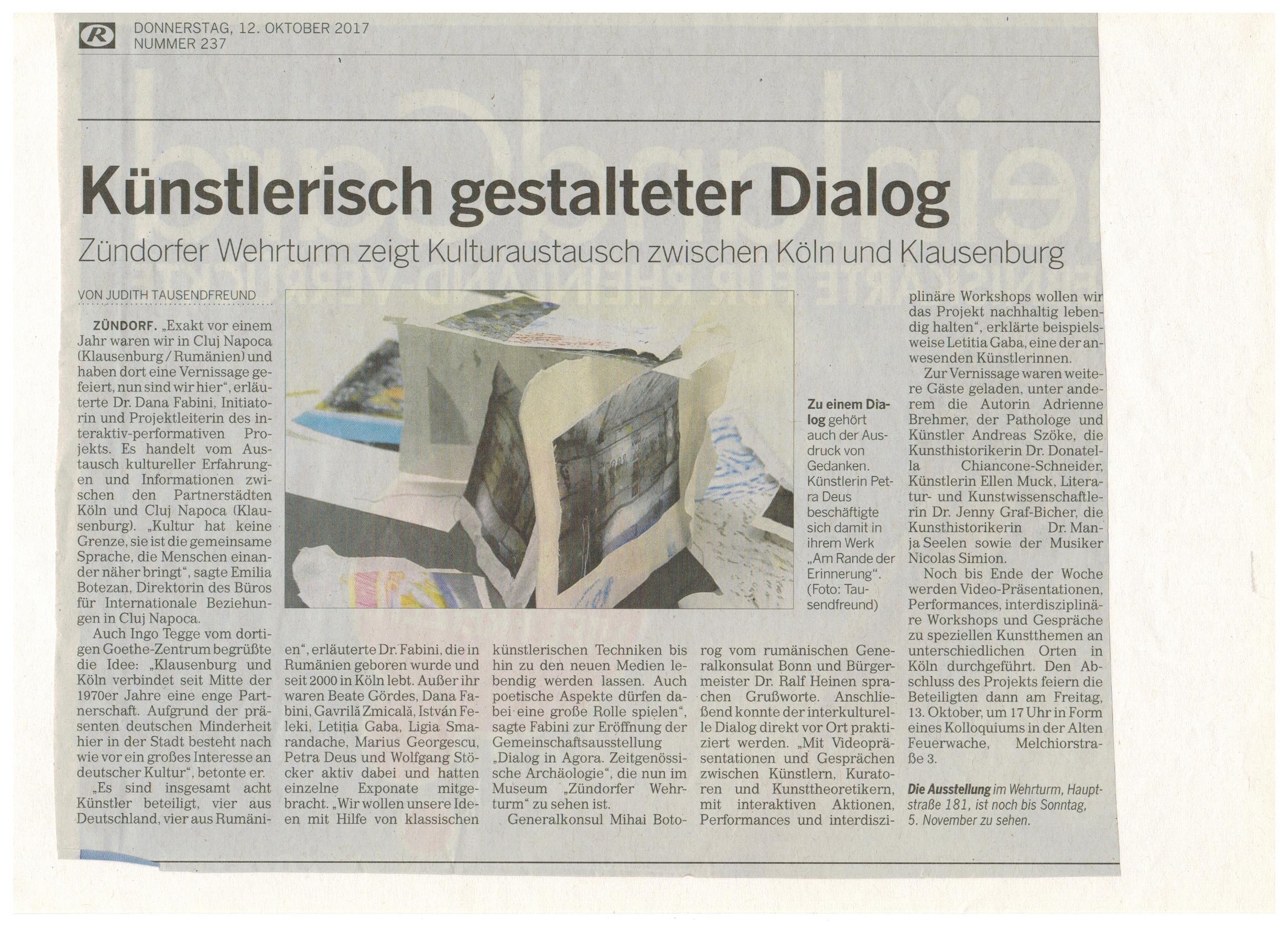 2023 Illustration der Kulturzeitschrift Tribuna, Nr.499, Cluj/Klausenburg...; Tribuna... / 2022 Interview Artexit, RO: PDF:...; Online... / 2021 FAAR Video-Interview... / IDA 2020, Frauenmuseum Bonn... / "Boah!", Kunstforum Schleiden... / Halle Zollstock 2020... / Offenes Atelier, Kölner Stadtanzeiger, 2019... / Dialog in Agora Part II, Köln PB..., PB2..., Video... / Dialog in Agora Part I, Cluj, RO; Video... / -O fata imposibila, Galerie Isola Art Brut, Frankfurt a. M., Video... / Outsalter; Ausstellung und Lesung, Köln... / Ceci n'est pas une femme, Köln ... / Puzzles of me, Köln... / Grafica Romaneasca/ Rum. Grafik aus Privatsammlungen, Bukarest... / TEXTIL, Köln ... / Grafica Romaneasca#4, Bukarest... / Elements of Nature, München... / Spaziergang durch Zeit und Raum, Köln..., Preisverleihung(KSTA)..., Kunst im Veedel... / 100 Jahre Lichthof... / Offene Ateliers... / Gemeinschaftsausstellung, Lugoj... / Ziarul Neconventional, Manuscris, Bukarest... / Ziarul Neconventional, Bukarest ... / Transferente, Köln ...(de), Transferente...(ro), ...(ro) / Flux of Lines, Timisoara..., TV-Timisoara, RO... / Ungesehen-Augenscheinlich, Siegburg... / Interferente-Einblicke... (ro), ...(de) / Artclue-Interview... (ro)/ 15.Internationale Graphik Triennale, Frechen... / Lichthof-Forum, Köln..., Video-Interview, Lichthof-Forum... / E.X.I.L, Bukarest... / Sein & Schein des Menschen, Köln... / Herzschlag des Lebens, Köln... / Weitere Presseausschnitte, Köln & Bukarest...--------------------------
