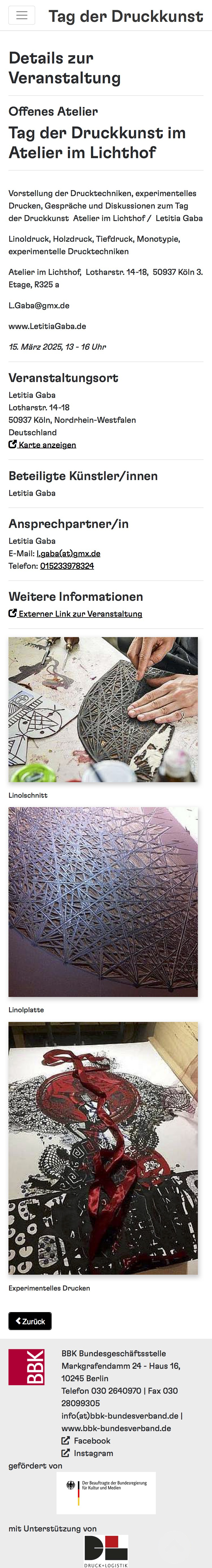 -------------------------- Ausstellungen (Auswahl) 2025 Grafica Romaneasca 2025, Galerie CĂMINUL ARTEI, Bukarest, RO... / Offenes Atelier im Lichthof, 27. und 28. Sep. 2025 ... 2024 & 2025 Printmaking Triennial - China Exhibition, The Tianyi Pavilion Museum Art Gallery, Ningbo, China (Katalog...) ... / Tag der Druckkunst... / 2024 11th International Graphic Triennial Bitola ITG, Dezember/Januar, Bitola, Mazedonien (Katalog...) ... / Grafica Romaneasca 2024, Galerie Caminul Artei, Bukarest... / Ins Blaue hinein..., Kunstforum Eifel, Schleiden-Gemünd... / Offene Ateliers Köln 2024... / Living in the Box, Civico 23 ArtSpace, Salerno & A60 Contemporary ArtSpace, Florenz... / Now, Galerie Gezer, Kibbutz Gezer, Israel / 2023 Sine Loco, Preisträgerin des Christine-Dobler-Grafikpreis 2023 (Katalog)... / -Imprint-Semioculus, Galerie Typa, Tartu, Estonia (Katalog)... / -AAmA 2023 WITHOUT BORDERS, Spazio Tiziano Zalli, Lodi, Italien, Infos... / -Grafica Romaneasca, Galeria Caminul Artei, Bukarest (Katalog)... / -Das Grauen in der Druckgrafik, Kölner Graphikwerkstatt, Köln... / -IDA 2023, Michael Horbach Stiftung, Köln (Katalog)... ; Programm:... / -Artemisia-Projekt Part I, Vamps...und andere Fiktionen, Galerie K49, Köln (Katalog)... / 2022 -Grafica Romaneasca 2022, Galeria Căminul Artei, Bukarest, RO (Katalog)... / -Offenes Atelier 2022... / -Response-Art (II), Künstlerforum Bonn...; Infos... / -„Șase – șase! Poartă-n casă!”, 1.Ed. zeitg. Kunst mit int. Beteiligung (Auszeichnung im Bereich Mischtechnik für das Werk "Totem"), UAP-Iasi (Katalog)... / -Artfusion, The HolyArt, London (Online-exhibition) / -Salonul International Outsider Art, Galeria de Artă Laurentiu Dimisca, Gura Vaii, Girov, RO... / 2021 -Response-Art (I), Künstlerforum Bonn (Katalog)... / -Symposium Wisdom Across the Ages, ASWM-Association for the Study of Women and Mythology, ASWM-Gallery, New York... / -Kunstroute Köln Süd 2021, Halle Zollstock / -Das Fremde in der Isolation, Halle Zollstock, Köln (Katalog)... / -Grafica Romaneasca, galeria Caminul Artei, Bukarest (Auszeichnung & Katalog)... / Offene Ateliers 2021... / -In the Time of Distress, virtual exhibition, CanvasArt Initiative, Kerala, India / -Tag der Druckkunst... / -Careu de Dame, Online-Ausstellung, UAPR Iasi, RO / -FAAR-Femmes/Frauen, 15th edition, Metz, F... / 2020 -Präsentaion des Projektes "More than 8", Lichthof-Forum für aktuelle Kunst; Ateliers im Lichthof (Katalog), Köln... / -Wir sind mehr: Eins!, Kubus Potsdamer Luisenplatz, Berlin / -Grafica Romaneasca, Caminul Artei, Bukarest (Katalog) /-Offenes Atelier & Lesung... / -Zeichnung pur, Kunstforum Eifel... / -IDA, interdiziplinäres Projekt, GEDOK, Frauenmuseum Bonn (Katalog)... / "More than 8", Ausstellung und Projekt, Zollstockhalle, Köln (Katalog)... / 2019 -Get the Point, Altes Pfandhaus, Köln... / -Über den TellerRand, Halle Zollstock, Köln / -Women Power in Art-110 artists from 13 private collections, Schloss Cantacuzino, Busteni, RO (Katalog)/ -The 26th Korea Art International Grand Exhibition, Itaewon-ro/Yongsan-gu Galerien, Seoul, (Auszeichnung für die Grafik "Rule the World") (Katalog) / -Veränderungen, Petersburger Raum für Kunst, Köln... / -Korea-Germany Intern. Art Festival, Glocken-Palast Museum, Gifhorn (Katalog) / -Dialog in Agora.Kosmopolit(ismus), Halle Zollstock (Katalog)... / -StaubKleid, Halle Zollstock, Köln... / -Kein Tag ohne Linie, Wissenschaftszentrum Bonn / -DRUCK MACHEN/Druckgrafik Heute, Petersburger Raum für Kunst, Köln... / 2018 -Transylvania is everywhere, Halle Zollstock, Köln / -VerWegen, GEDOK, Handwerkskammer zu Köln... / -An der Grenze, Halle Zollstock, Köln... / -Grafica Romaneasca, Caminul Artei, Bukarest (Katalog) / -105°, Galerie ArtTrace, Tokyo... / -O fata imposibila, Galerie Isola Art Brut, Frankfurt a. M.... / -ARTich, Galerie Petersburger, Köln... / -Frauen kurz & knapp #2018, Lichthof-Forum f. aktuelle Kunst, Köln / 2017 -Dialog in Agora, Museum Wehrturm, Köln (Katalog)... / -Europäische Biennale für zeitgenössische Druckgrafiken, Kunstmuseum Ploiesti, RO (Katalog) / -Transylvania & Kunst im Kontext-Dialog in Agora, Galerie 21, Köln / -Outsalter, Galerie Display, Köln... / -Grafica Romaneasca#17, Caminul Artei, Bukarest, RO (Katalog) / -Dialog in Agora/Präsentation, Kunstmuseum, Cluj-Napoca, RO / -Food Waste, National Museum of Nairobi, Kenia (Katalog) / -Die Freiheit, die ich meinte, Galerie 0/Smend, Köln / -Ceci n'est pas une femme, Künstlerforum Remagen... / 2016 -Dialog in Agora/Präsentation, Morphomata/Universität zu Köln / -Dialog in Agora/zeitgenössische Archäologie, Cluj; Programm..., Flyer... / -Estampadura, Graphik-Triennale 2016, Toulouse, F (Katalog) / -3 Positionen, Galerie Studio NOVO Artspace, Köln... / -23. Korea Art International Open Exhibition, YoungSan Art Gallery, Seoul, ROK (Katalog) / -DAF 11-Danya International Art Fair, Auszeichnung für die Arbeit "Das Rad", ROK (Katalog) / -Puzzles of me, Galerie Studio NOVO Artspace, Köln (Katalog)... / -Köln Süd-Offen..., Grevy-Freie Gestalterische Republik, Köln / -Frauen in Forschung und Gesellschaft, GESIS, Köln / -Open Space, Galerie Studio NOVO Artspace, Köln... / 2015 -Grafica Romaneasca #2015, Galerie Caminul Artei, Bukarest, RO (Katalog)... / -Split Graphic, Grafikbiennale, Split, Kroatien (Katalog)... / -Kultur trifft Culture, Forschungszentrum CESAR, Bonn / -Kleine Formate, Galerie A24, Technologie-Park, Berg. Gladbach / -14 Atelierkünstler & ihre Gäste, Lichthof-Forum, Köln... / -OA-Grevy/Freie Gestalterische Republik, Köln... / -Danya International Art Fair #2015, ROK (Katalog) / -Grafiken aus rumänischen Sammlungen, Nationalmuseum D. Gusti, Bukarest, RO... / 2014 -Künstler der Galerie, Galerie HaufeKonzept, Köln... / -Grafica Romaneasca #2014, Galerie Caminul Artei, Bukarest, RO (Katalog)... / -Danya International Art Fair #2014, ROK (Katalog) / -art'pu:l, Kunstmesse, Windeck (Katalog) / -Pfützen, Lichthof-Forum & K