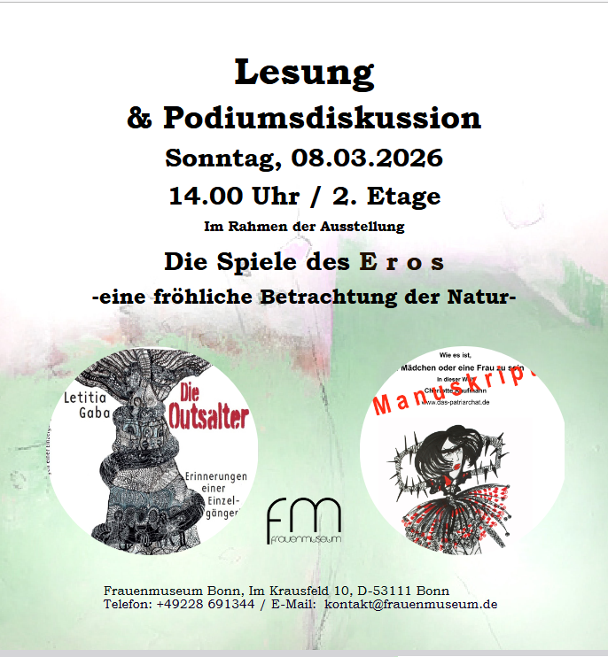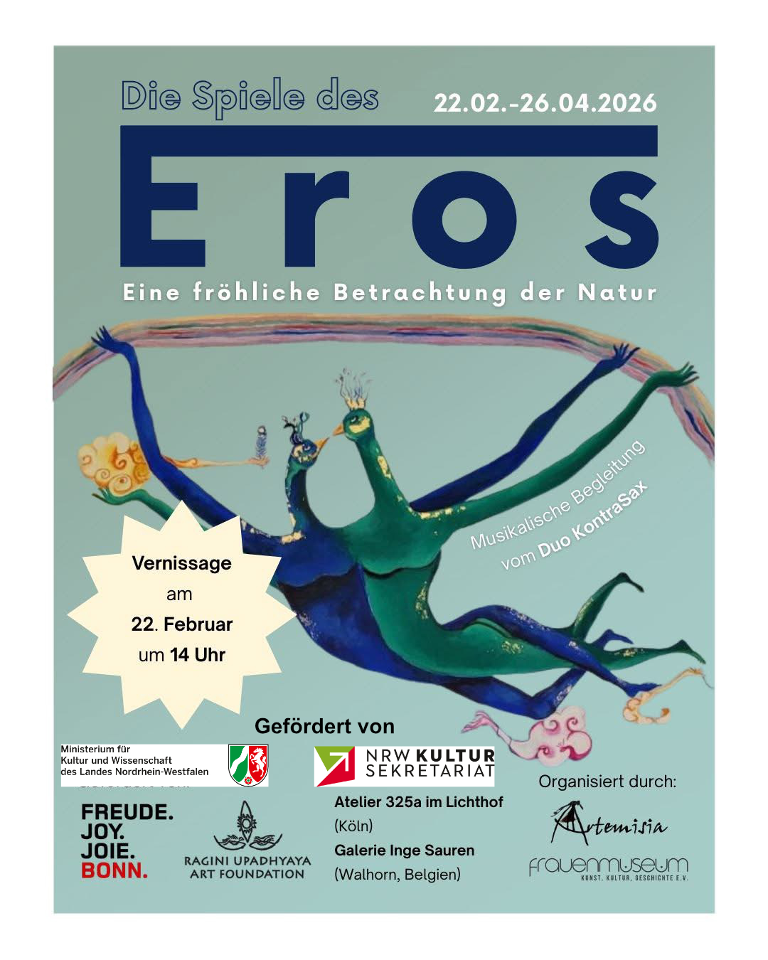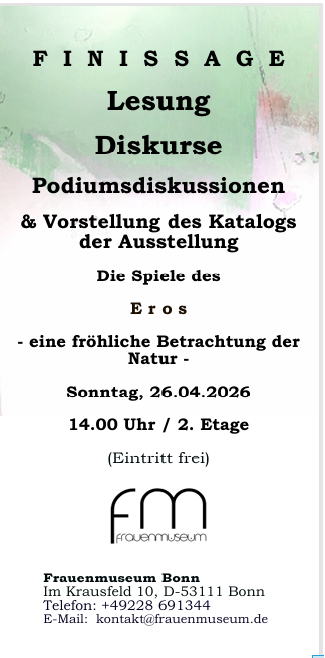 > Die Spiele des Eros - Eine fröhliche Betrachtung der Natur / Vernissage: 22. Februar, 14.00 Uhr / Lesung: 08.03.2026, 14.00 Uhr / Finissage: 26.04.2026, 14.00 Uhr / Frauenmuseum Bonn / Plakat... / Einladungskarte... Zur Ausstellung erscheint ein Katalog