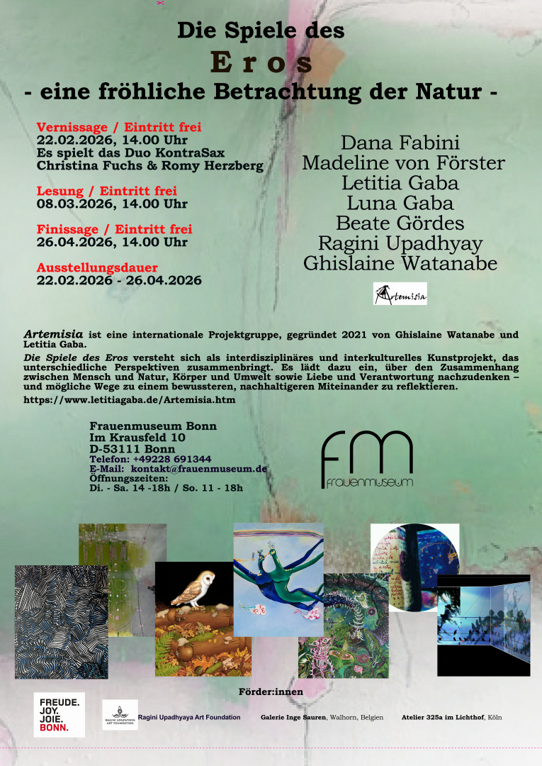 Aktuell > coming soon > > Die Spiele des Eros - Eine fröhliche Betrachtung der Natur / Vernissage: 22. Februar, 14.00 Uhr / Lesung: 08.03.2026, 14.00 Uhr / Finissage: 26.04.2026, 14.00 Uhr / Frauenmuseum Bonn / Einladungskarte... / Plakat...> Paradies / 06. September bis 04. Oktober 2026, Museum Wehrturm Köln (Weitere Informationen folgen)
