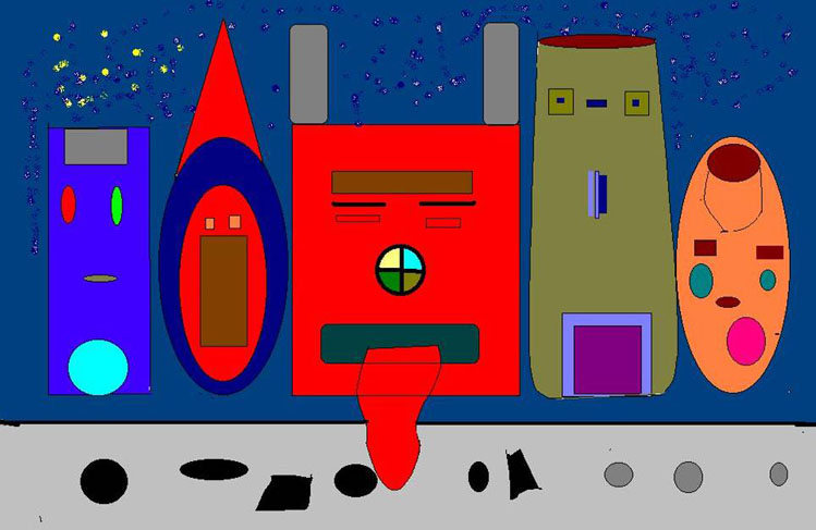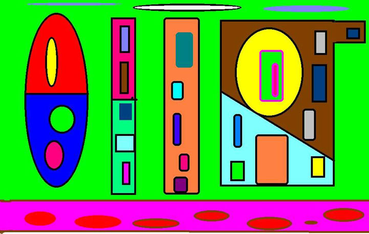 Häuser mit Augen als Fenster , Mund als Tür , Hut als Haare,...